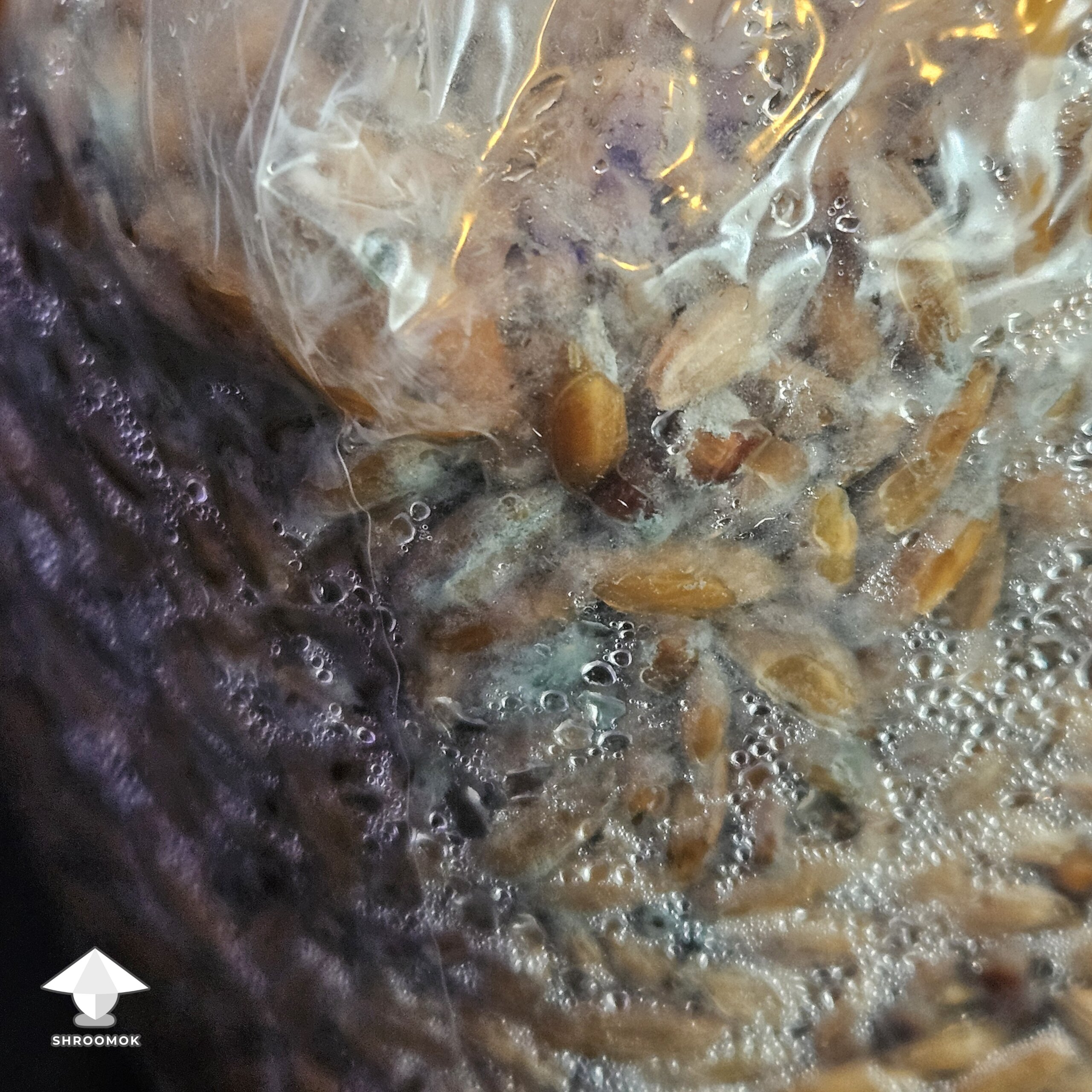 Image from forum thread Slightly Grey Greenish color on some of the grain, other areas growing healthy mycelium. Is this contaminated? post #120 #2
